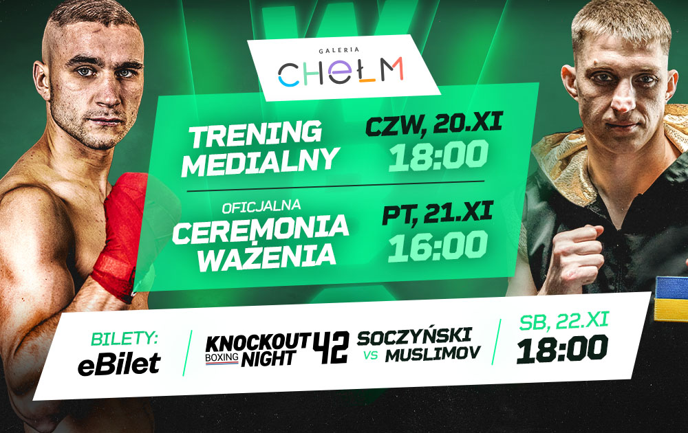 Zapraszamy wszystkich kibiców na FIGHT WEEK przed galą Knockout Boxing Night 42 w Chełmie! W walce wieczoru kibiców czeka wyjątkowa stawka: Michał Soczyński (11-0, 8 KO), mieszkaniec Chełma, stanie przed swoją pierwszą mistrzowską szansą – walką o pas WBC Baltic! Rywalem Soczka będzie niepokonany mistrz Ukrainy, Ramazan Muslimov (8-0, 5 KO). Zwycięstwo w tym starciu może otworzyć Polakowi drogę do pojedynku o mistrzostwo świata!